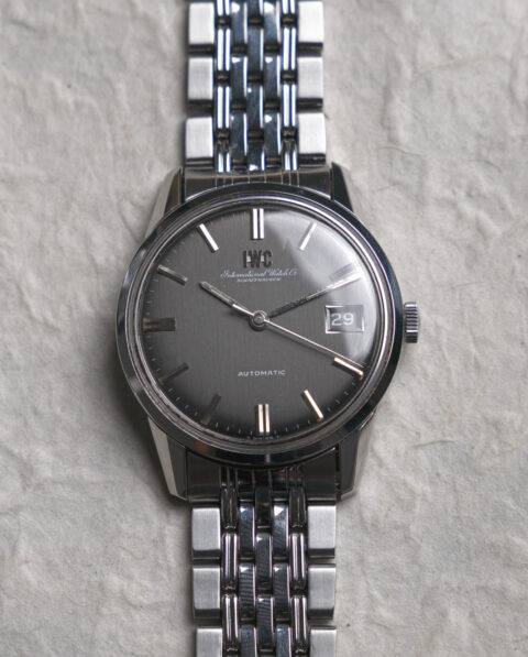 This is a piece that you will not see several times in a lifetime. A magnificent IWC with a brushed slate gray dial, with applied and painted IWC logo, all its tritium plots, a date display at three o’clock with date disc, also anthracite, with the numerals painted in white. Its great asset is to come accompanied by a 7-row IWC bracelet signed by the superb Gay Frères manufacturer.