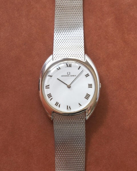 We appreciate this Universal Genève for its sobriety and the freshness of its dial. A “C-Case” format steel watch, enhanced by a beautiful white lacquered dial and black painted Roman numerals. We appreciate its mesh bracelet signed Universal Genève.