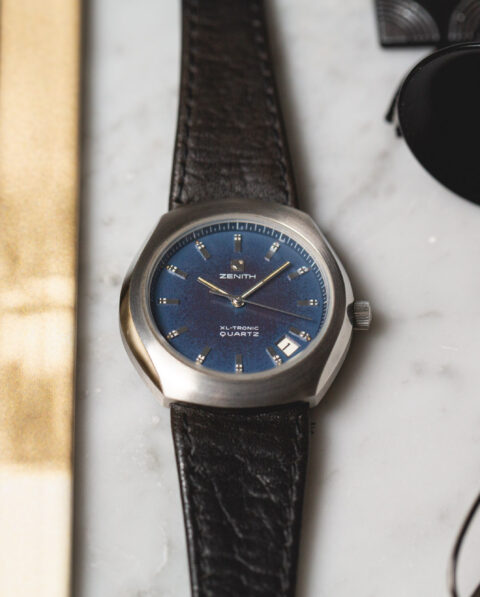 A watch that perfectly represents 1970s watchmaking with an electronic quartz movement, an imposing shaped case and a magnificent gradient light blue dial. Here in new old stock and never worn, with its Zenith strap, its Zenith buckle, as well as its original label.