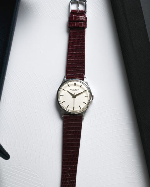 Une fine IWC au magnifique cadran blanc et ses repères en pointe d’acier pour aller de pair avec les index facettés, survolés par des aiguilles Dauphine. A l’intérieur, l’exceptionnel mouvement mécanique 89, aux décorations magnifiques, comprendre côte de Genève et anglage.