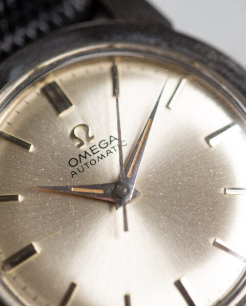 Une très jolie Omega dont la mention Seamaster n’apparait pas sur le cadran, mais bien gravée sur le fond de boite. Un cadran argenté soleillé avec ses points tritium ainsi que ses belles aiguilles dauphines elles aussi avec leur tritium vieilli. Et un mouvement Omega à bumper qui fait la signature de cette très belle montre des années 1950.