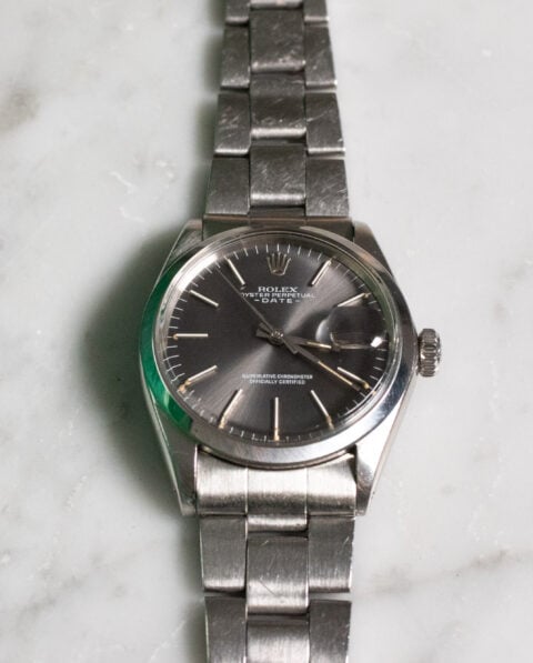 Une Rolex Date que nous apprécions grâce à son somptueux cadran gris/taupe qui a la particularité d’être « Sigma », et donc de posséder ses index et aiguilles en or. Ici, la montre vient accompagnée de son très léger bracelet Oyster en acier plié.