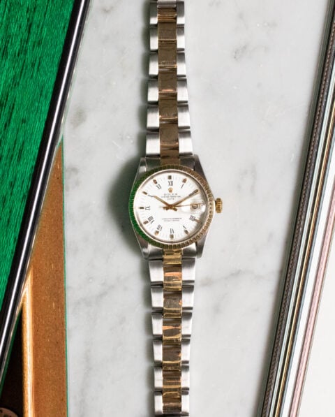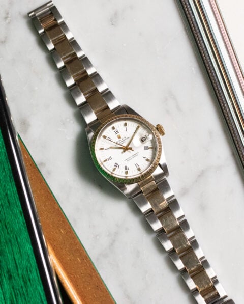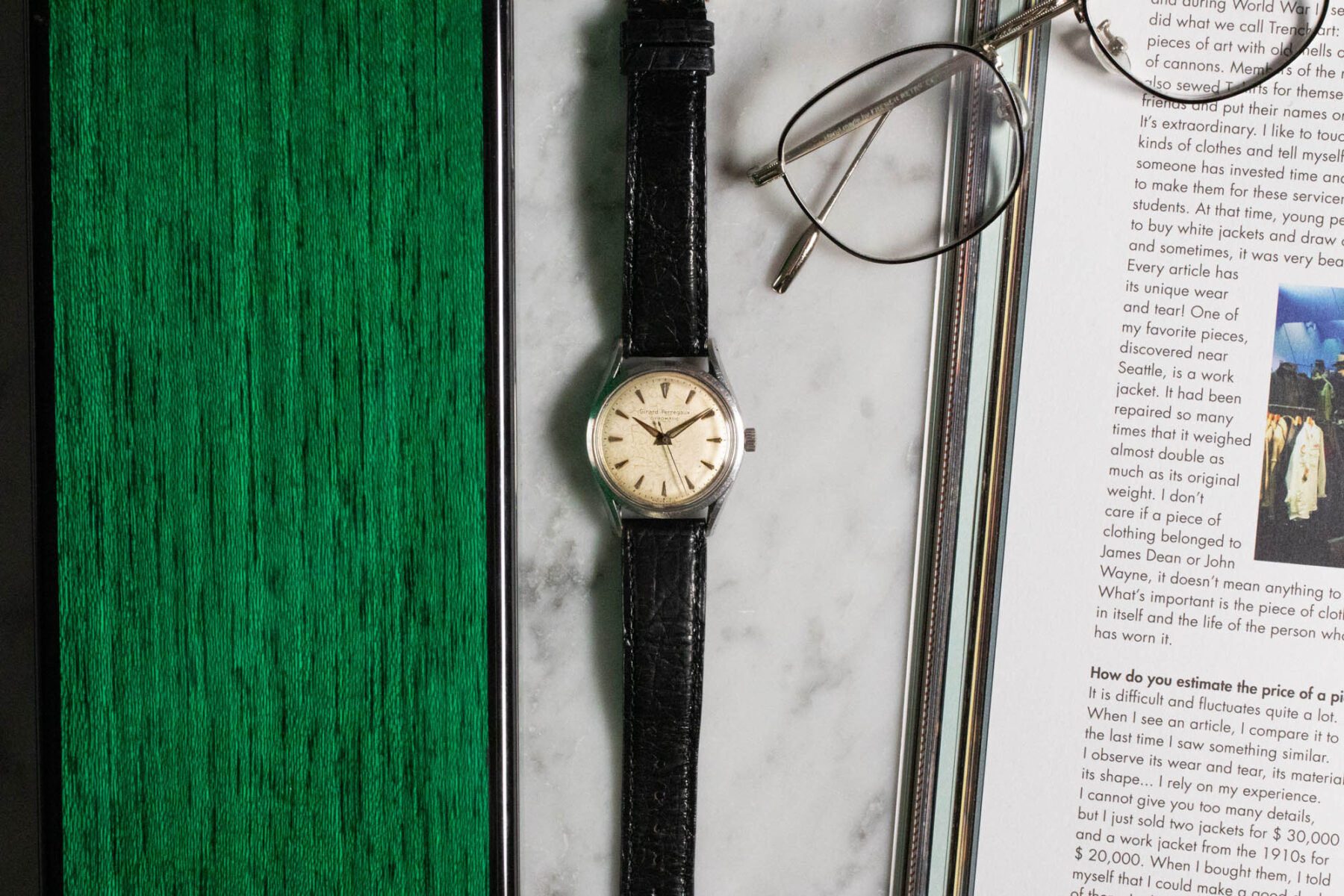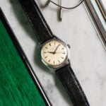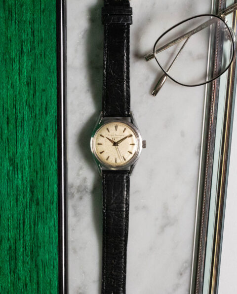 We immediately remark the lugs of this Girard-Perregaux: very thin, curved and inclined, they give the case a dynamic air. We appreciate the harmonious patina of the “spider” style dial and the applied faceted arrow-shaped hour markers, not to mention the Alpha hands.