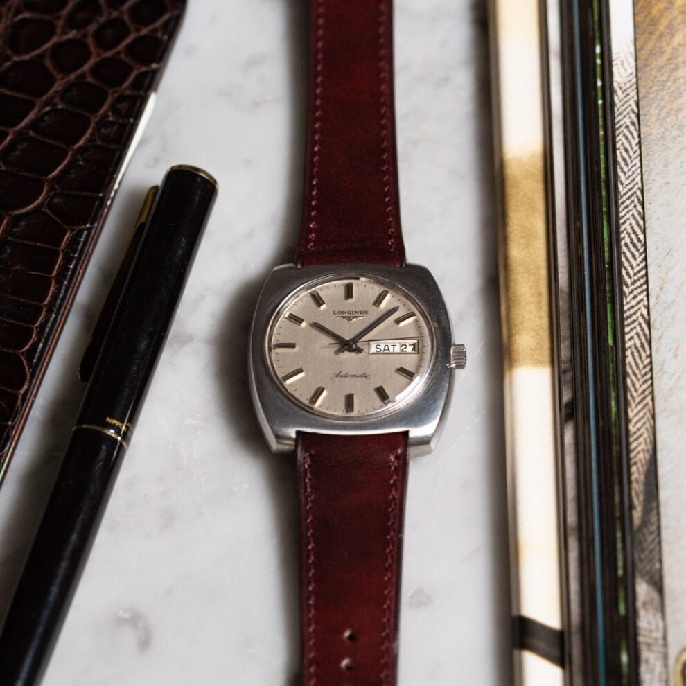 You will find on this beautiful piece a brushed silver dial with large hour markers which presents beautiful “Automatic” typography, and especially the display of the day and the date at three o’clock. All this is thanks to the caliber 508 which sends us back to the mid-1970s by its serial number.