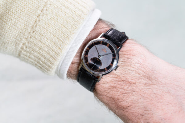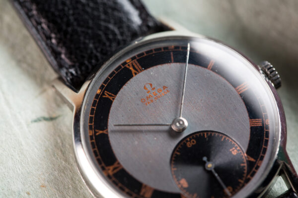 An exceptional sector dial that creates all the charm and rarity of this Omega. A slate gray centre, a black small seconds hand and its gilded index numerals, an hour scale with its equally gilded Roman numerals and a black minute track.