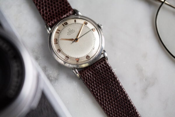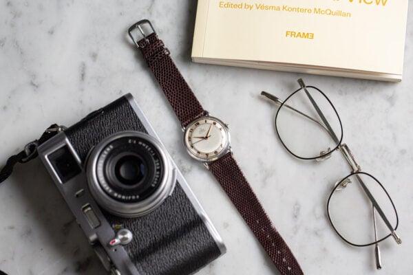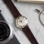 The first thing that fascinates on first encounter with this watch are its shiny painted Arabic numerals in a rounded typography. Numbers that go perfectly with the Alpha hands, also golden. We appreciate its steel case with small cow horn lugs. Calf’s horn shall we say …