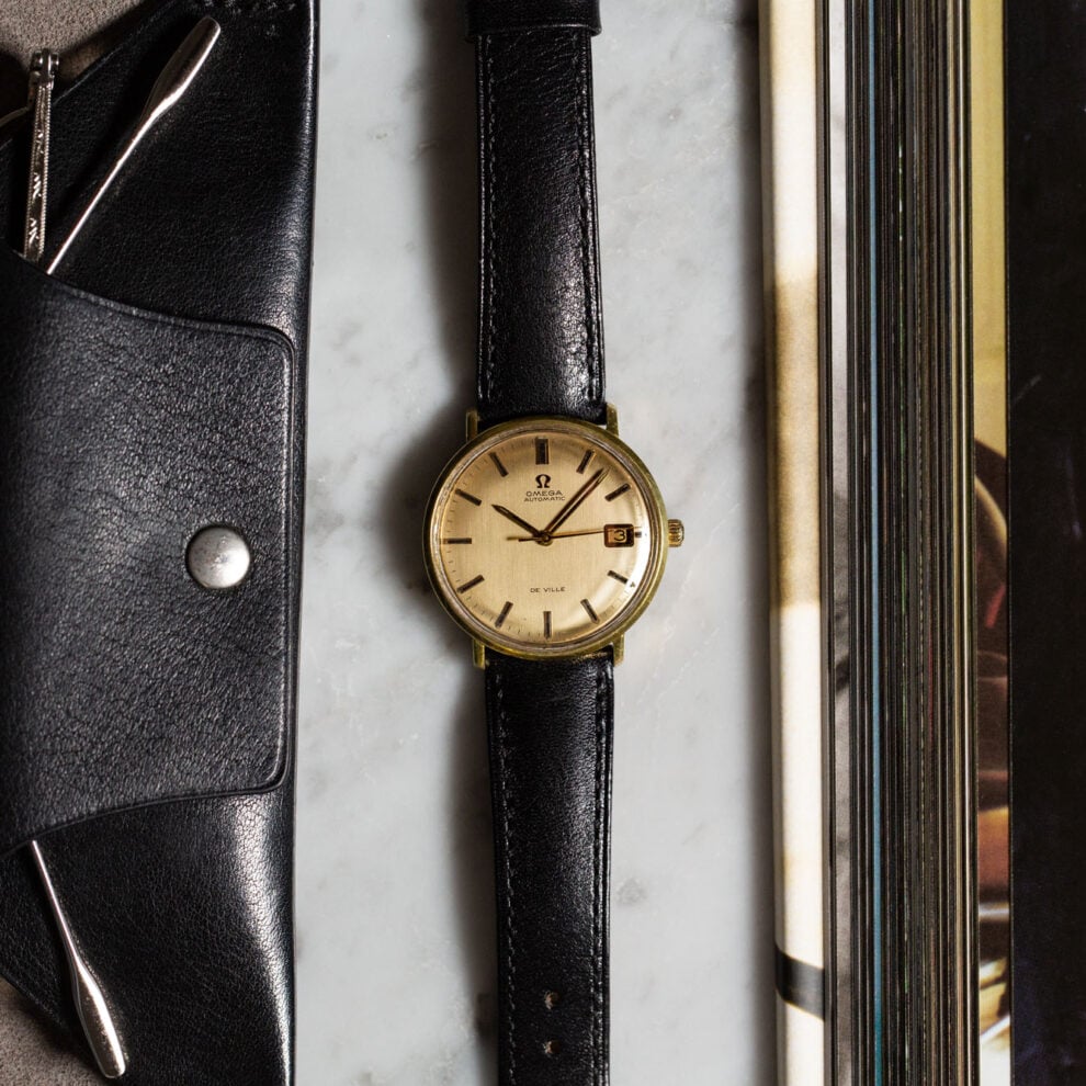 Here is the first model identified with only the mention “De Ville” on the dial, successor to the De Ville Seamaster which had the mention in addition on the dial. The dial also made of solid gold, with its golden and onyx hour markers and its hands so particular to Omega, and the date at 3 o’clock powered by the caliber 565 with a date.