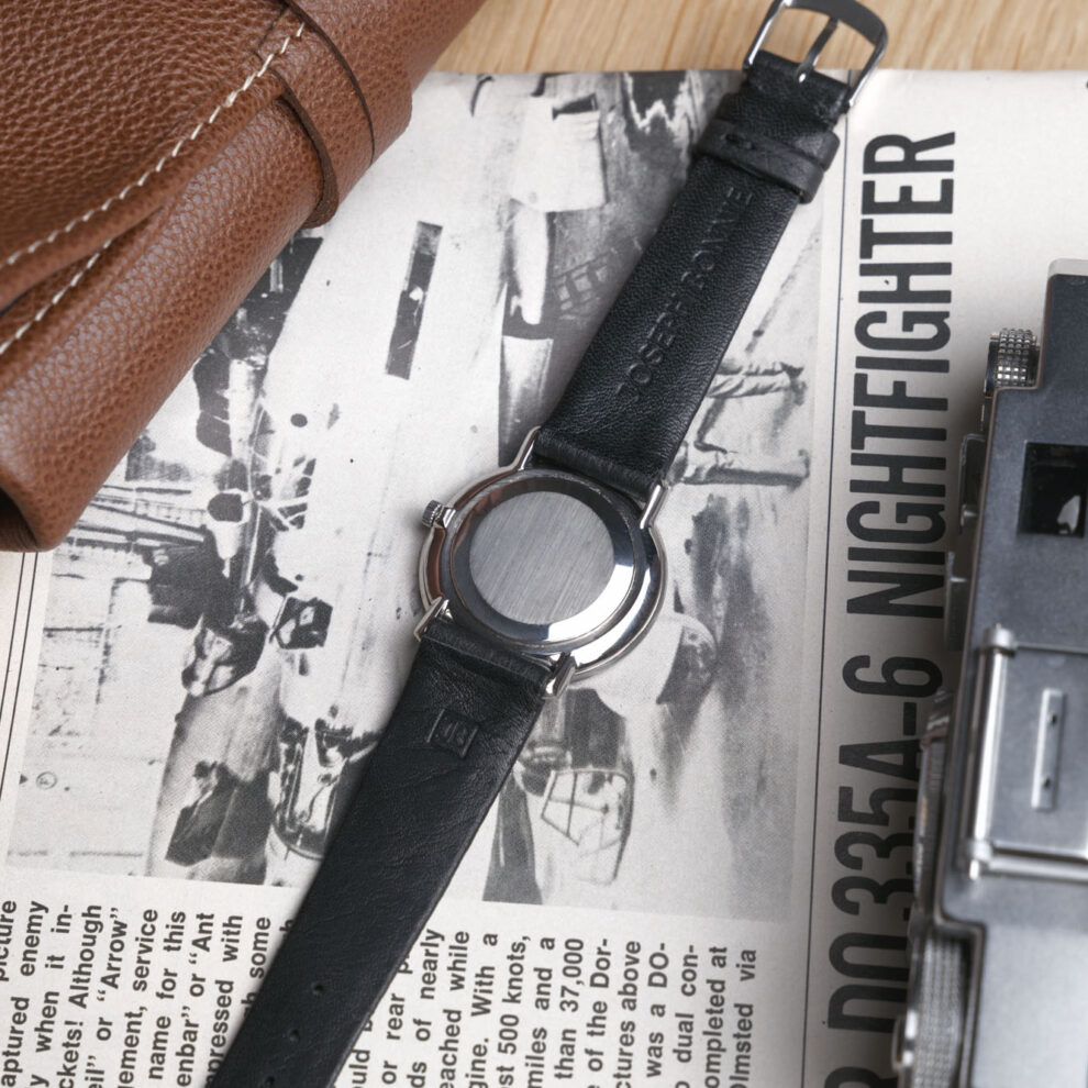 A watch in very good condition, with a very beautiful gray dial, very lightly brushed with beautiful white writing and two simple wire hands, also white.