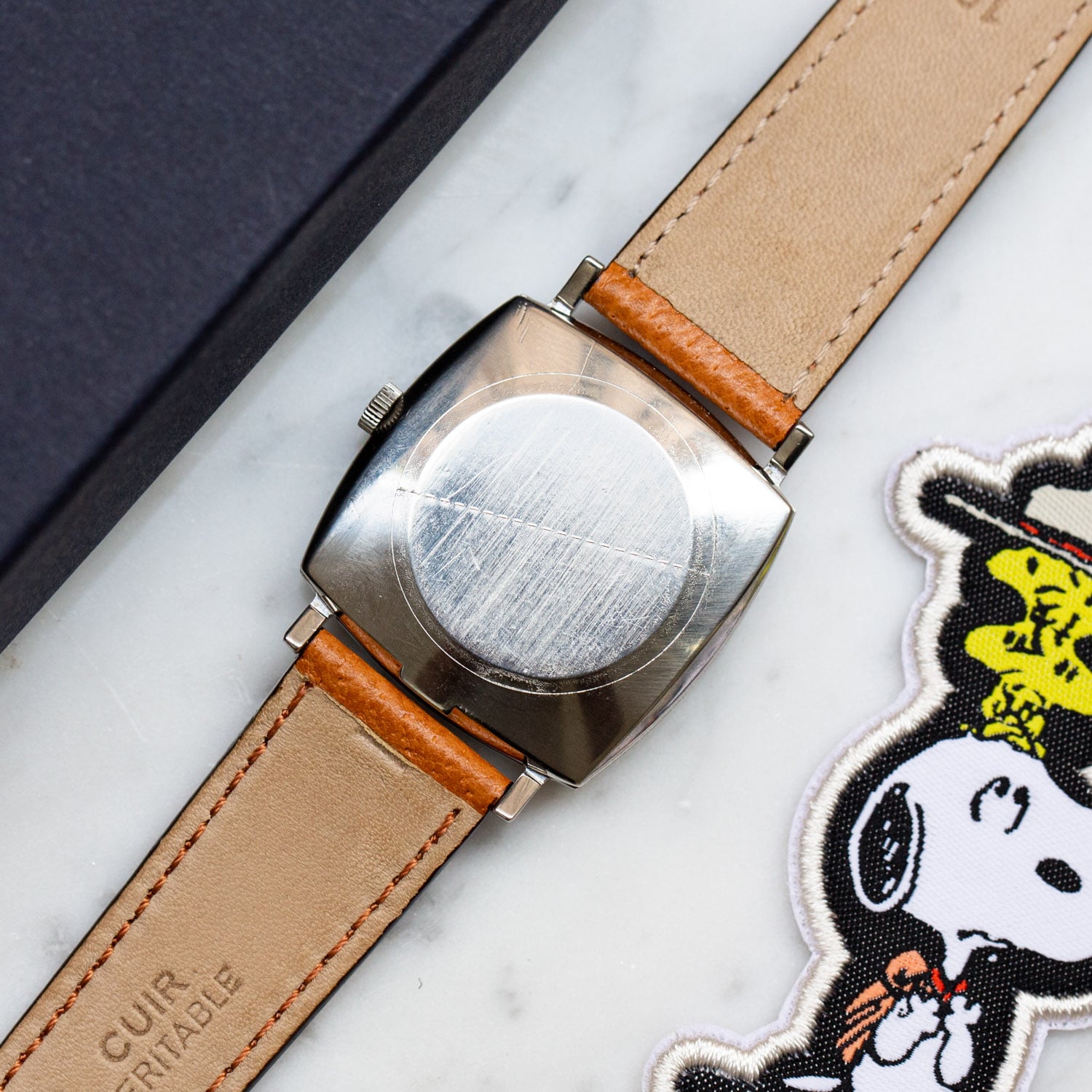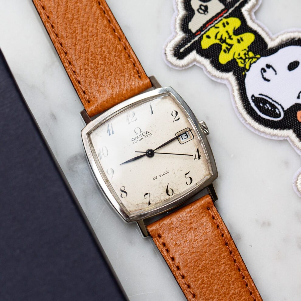 A watch which we particularly appreciate for its shape and large size, immaculate golden dial with its applied Omega logo and smooth sunburst bezel.