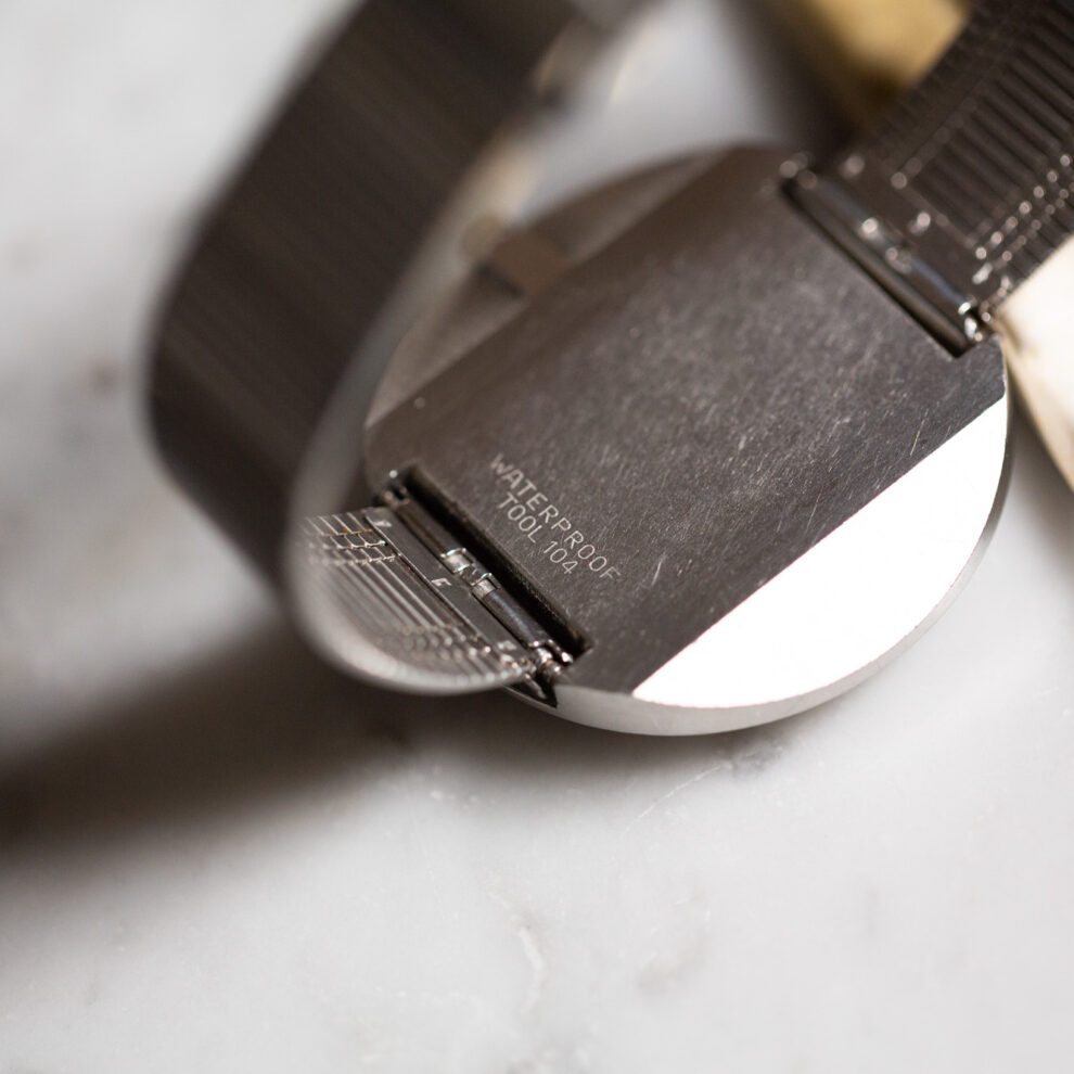 Characterized by a super waterproof Unicoc (monobloc) steel case, this beautiful Omega reveals a large bezel with a sun-brushed finish that hides the lugs. Here, the particularity is to have a magnificent gray dial with steel and white painted hour markers, white thin hands and the Omega logo applied at noon.