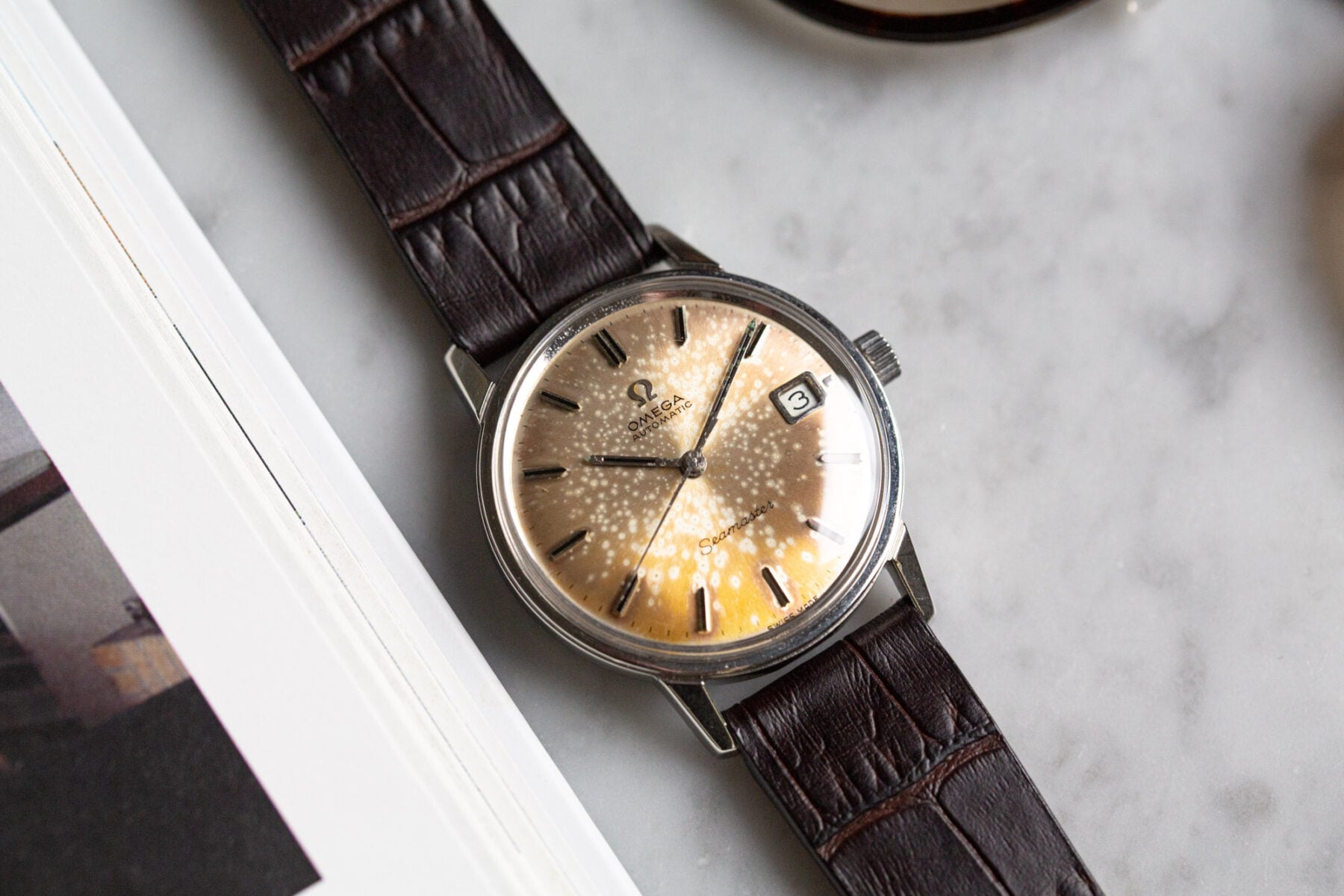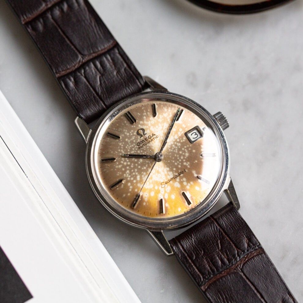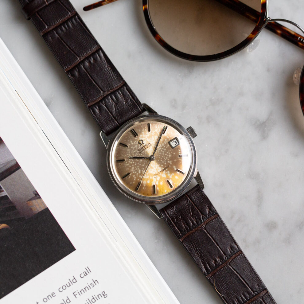 A piece selected for its very good condition, but which has a patina that we have nicknamed “Bambi”. The pattern of the little fawn’s fur is clearly visible on the original sunray silver dial. We really like the applied Omega logo on this beautiful piece dating back to the mid-1960s.
