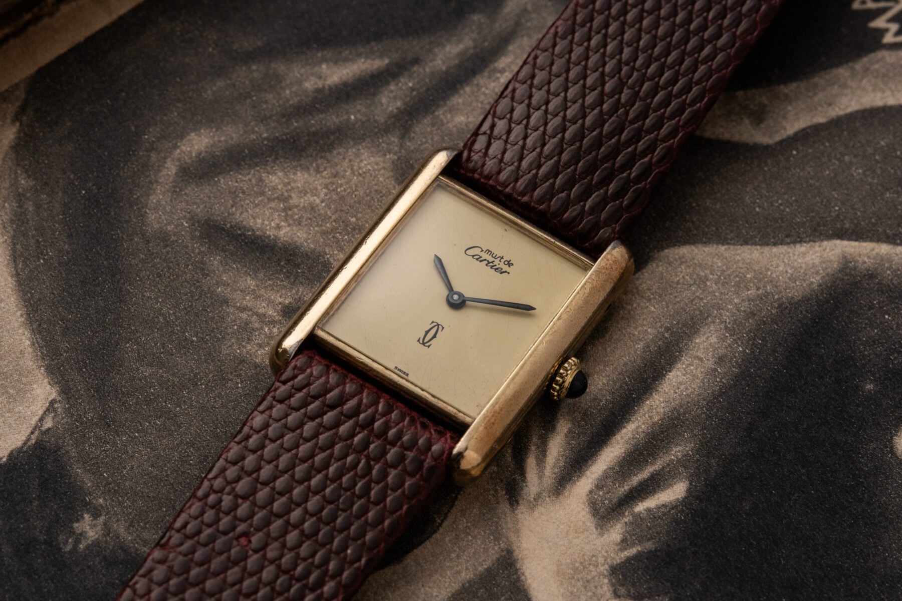 A Cartier Tank Must that we appreciate first and foremost for its delightful “lemon tart” dial. A dial with black lettering and the Cartier logo, accompanied by two blued sword hands, a signature of the brand. The case is vermeil, meaning silver plated with gold, and houses a basic ETA manual-winding mechanical movement. The watch is completed with its original Cartier-signed pin buckle.