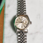 We particularly appreciate this Rolex Datejust with its “no lume” dial with beautiful short and faceted hour markers as well as its fluted bezel in gold alloy and its folded steel Jubilee bracelet.