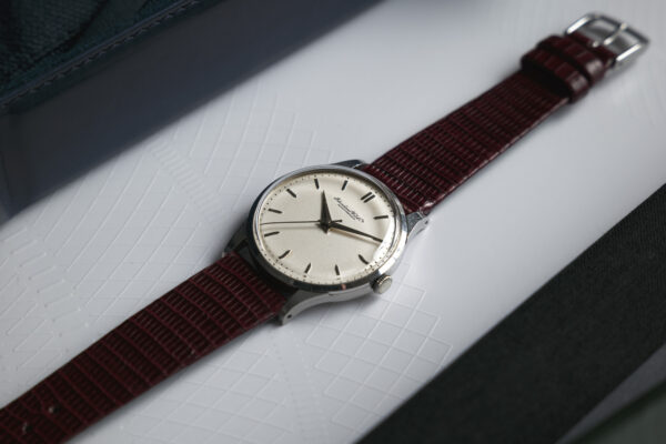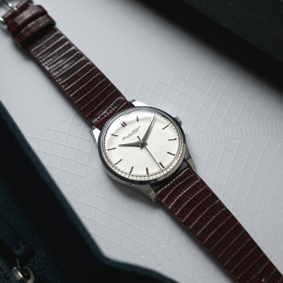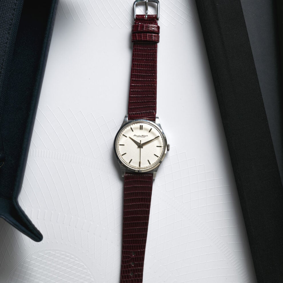 Une fine IWC au magnifique cadran blanc et ses repères en pointe d’acier pour aller de pair avec les index facettés, survolés par des aiguilles Dauphine. A l’intérieur, l’exceptionnel mouvement mécanique 89, aux décorations magnifiques, comprendre côte de Genève et anglage.