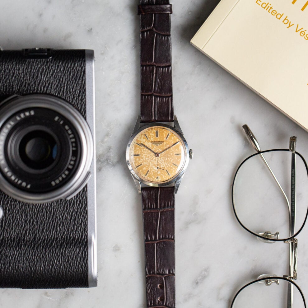 Une très jolie pièce que l’on apprécie par son boitier de bonne taille pour l’époque avec 34 mm, un boitier en acier aux cornes bien travaillées, fines et allongées, et surtout un cadran patiné de manière homogène que nous avons surnommé expresso pour la ressemblance avec la mousse du café.