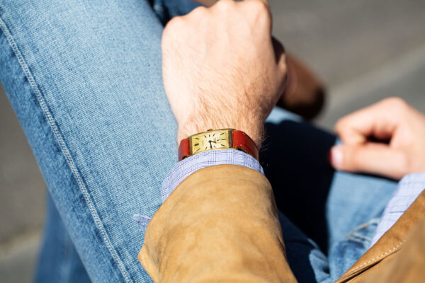 Un cadran doré magnifique et légèrement patiné, aux index glaives peints, la minuterie chemin de fer et les aiguilles bleuies. À l’intérieur, un calibre Movado Chronomètre très bien fini qui s’insère dans un boitier en or 18k (750) légèrement incurvé.