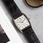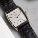Ce qui caractérise cette Omega n’est autre que son état neuf de stock, sans parler de sa grande finesse permise par le calibre extra-plat 711. Une montre qui date du début des années 1970 avec son magnifique cadran argenté avec insert acier/onyx, ses mentions peintes avec léger sérif, et deux aiguilles simples. Une grande élégance dans un boitier poli et brossé.