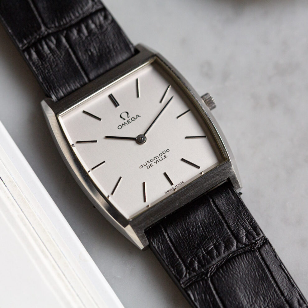 « Dans le monde de la mode, du chic et du charme, les De Ville au style distingué et à la finition soignée symbolisent l’élégance, du classicisme le plus sobre à la fantaisie du meilleur goût » la phrase du livre Omega de Marco Richon est on ne peut plus claire. En voici pour exemple une très belle Omega De Ville Automatic format tonneau.