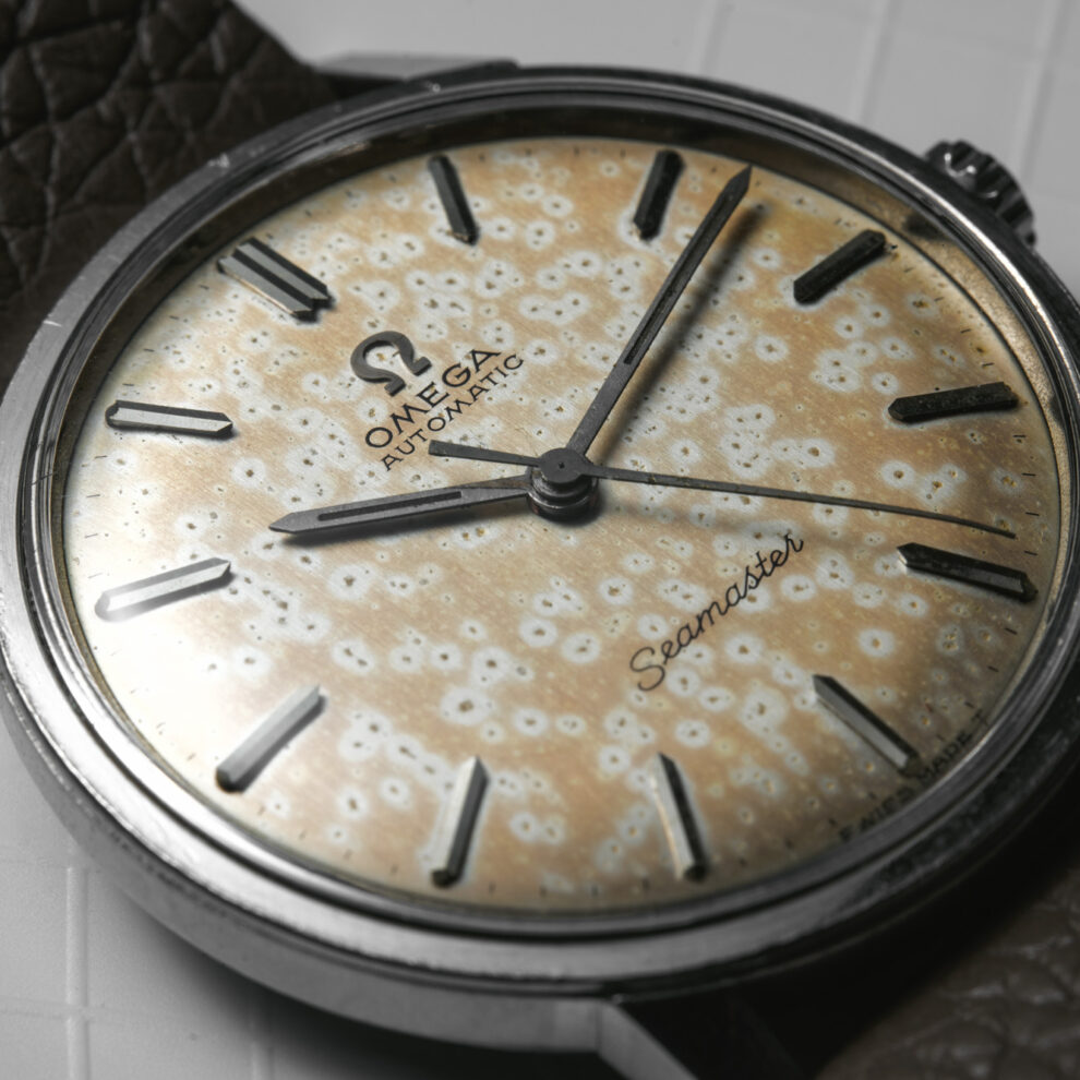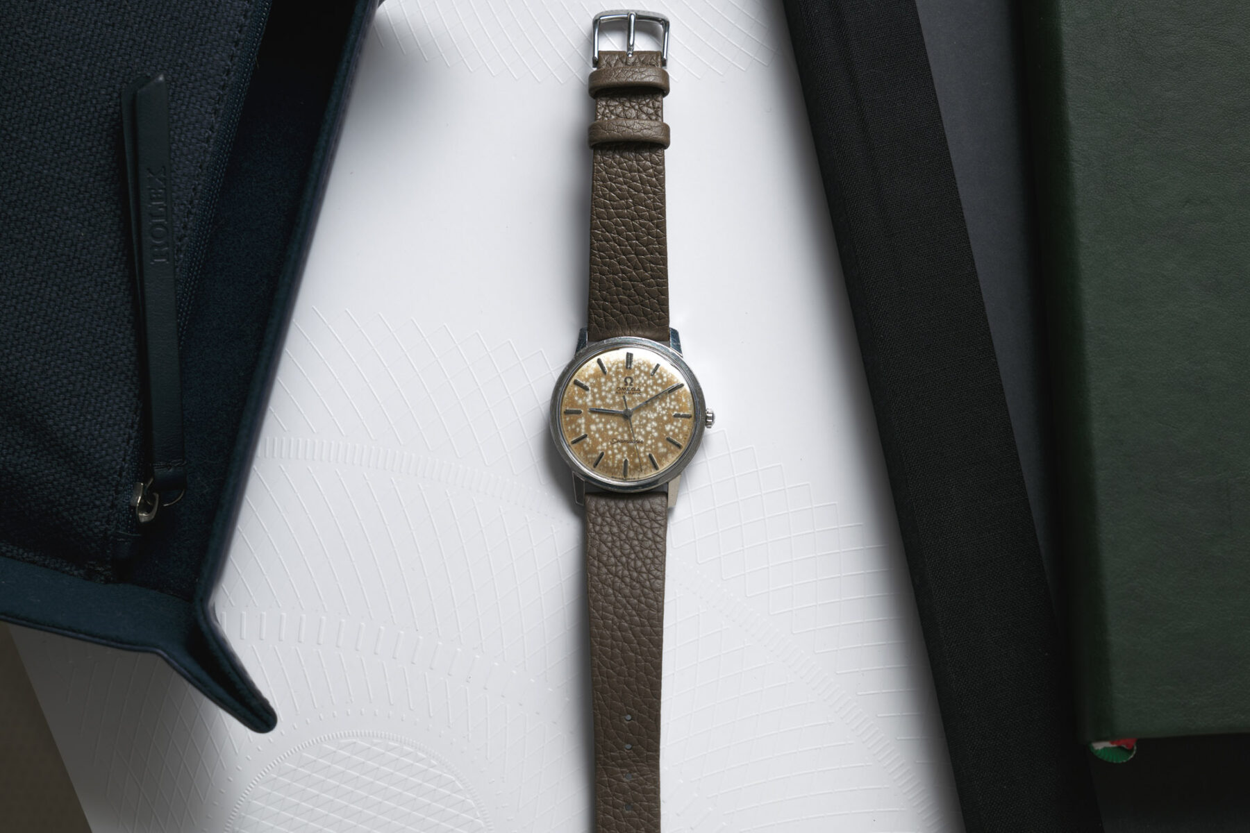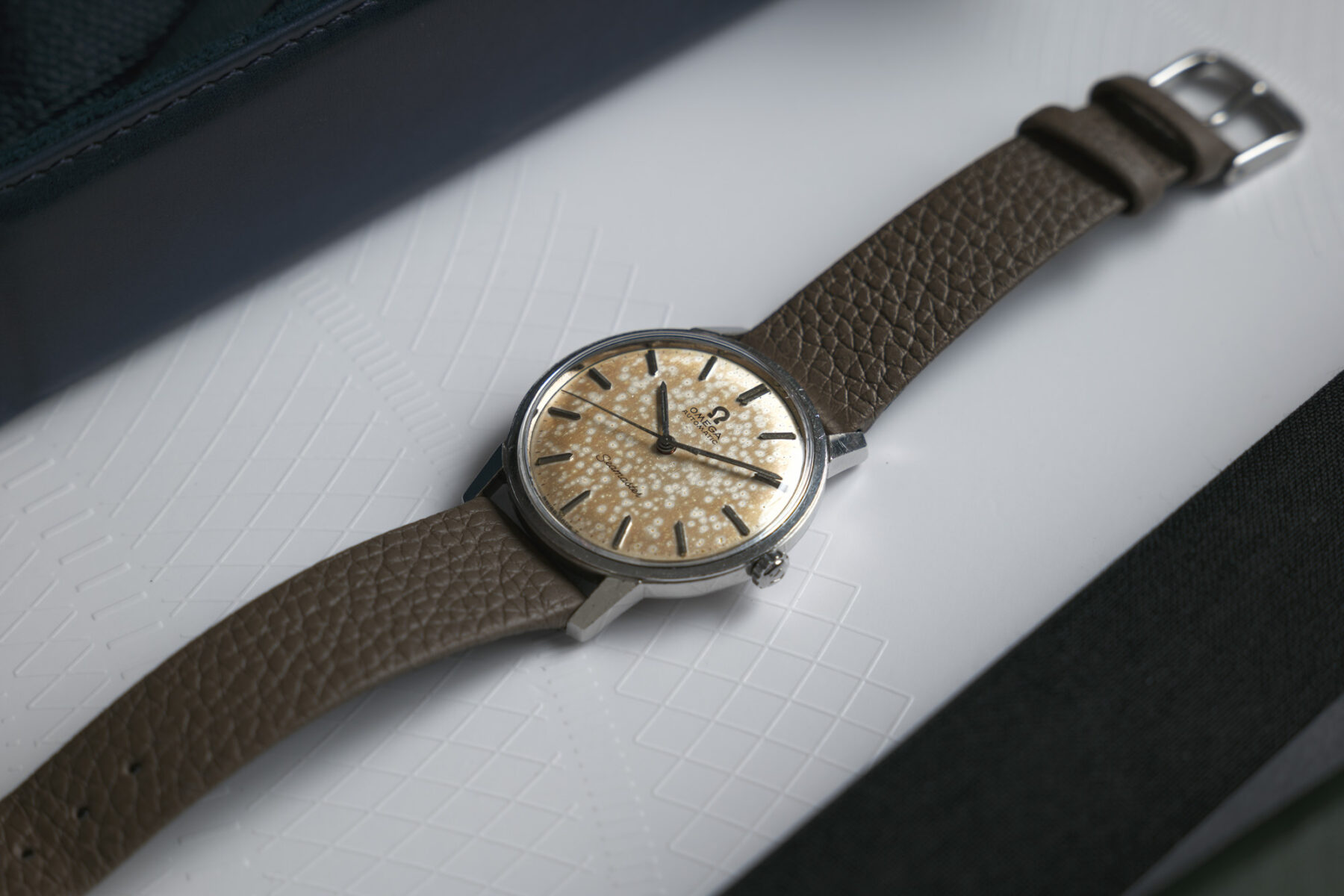 Une pièce sélectionnée pour son état à la fois très bon, mais qui possède une patine que nous avons surnommé « Bambi », la deuxième fois, fait incroyable ! Le motif de la peau du petit faon et en effet bien visible sur le cadran argenté soleillé à l’origine. On apprécie le logo Omega en applique, pour une très belle pièce datant du milieu des années 1960.