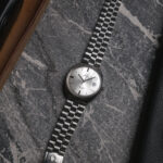 Cet exemplaire se trouve dans un état splendide, où le boitier tonneau dévoile encore un très beau soleillé sur la lunette. On y trouve un cadran argenté soleillé très spacieux, composé d’index peints et d’index en acier et onyx. Une pièce qui vient avec son bracelet en acier Omega.