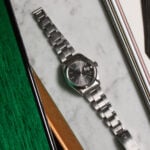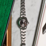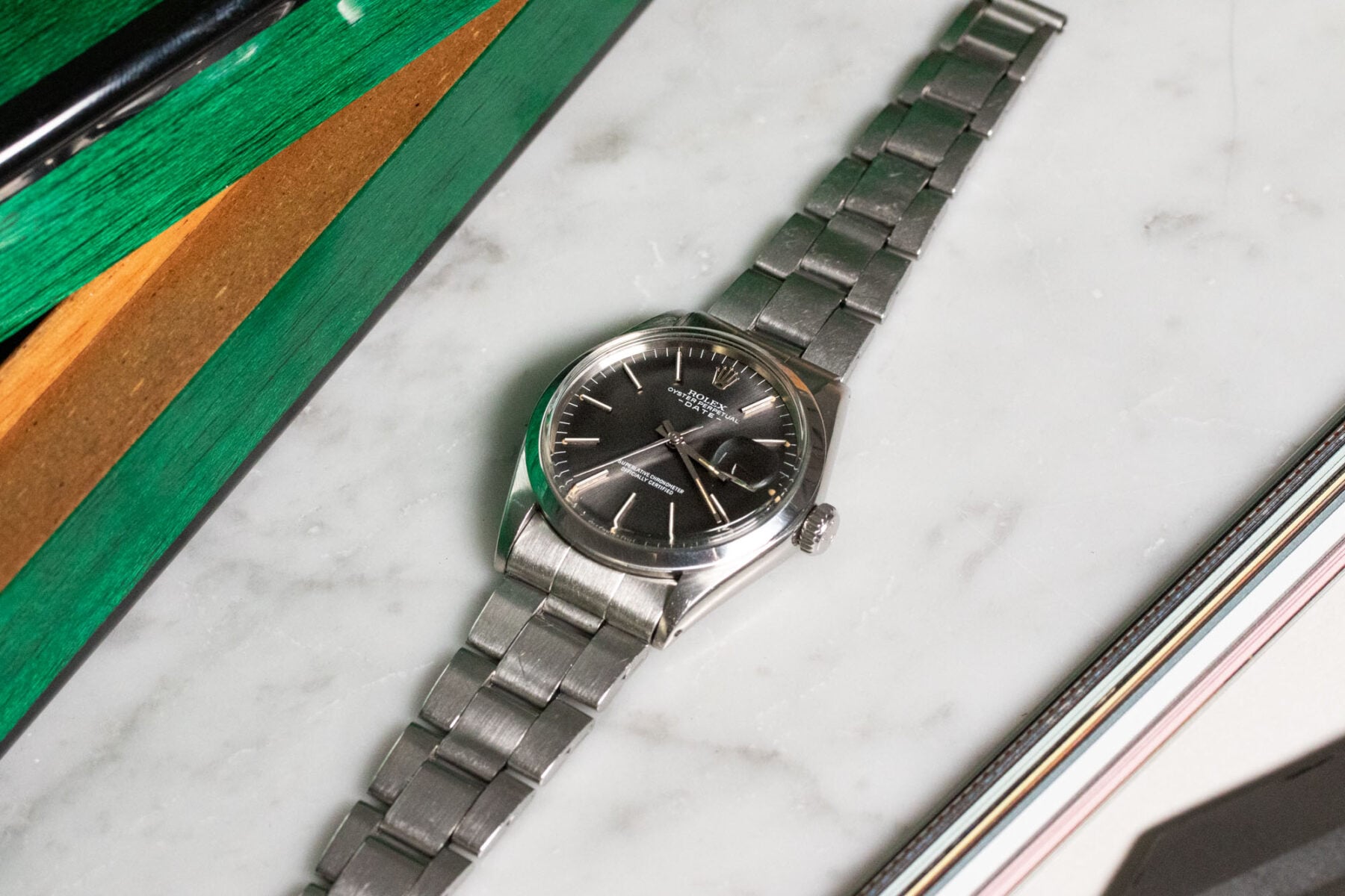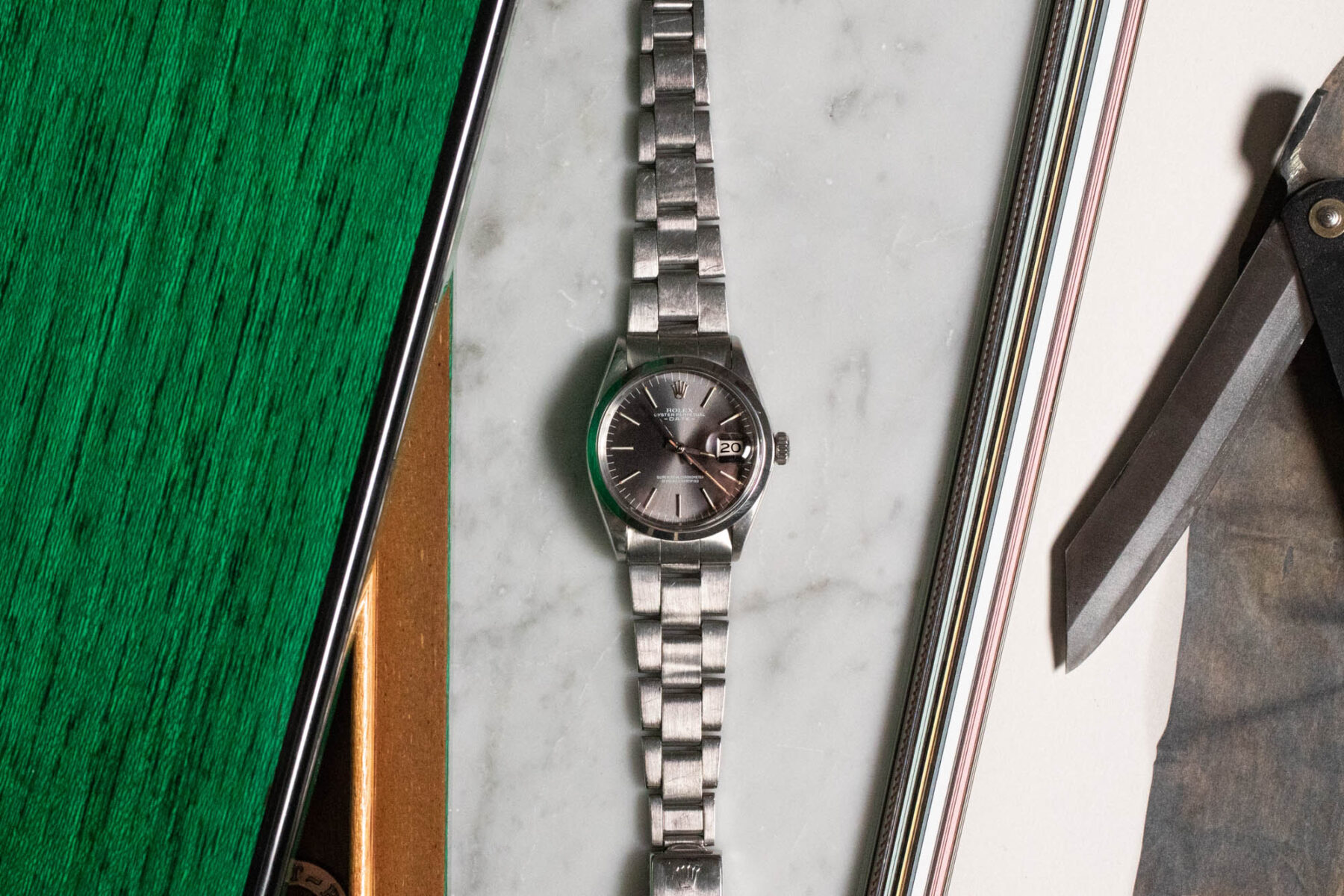 Une Rolex Date que nous apprécions grâce à son somptueux cadran gris/taupe qui a la particularité d’être « Sigma », et donc de posséder ses index et aiguilles en or. Ici, la montre vient accompagnée de son très léger bracelet Oyster en acier plié.