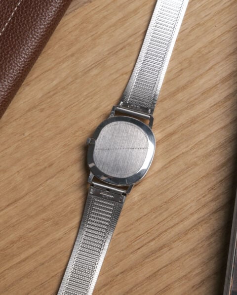 On remarque cette montre Tissot grâce à son très beau et important boitier typique des années 1970, accompagné d’un mouvement de chronographe avec totalisateur des minutes par aiguille centrale à extrémité de flèche, qui n’est autre qu’un calibre Lemania 1343.