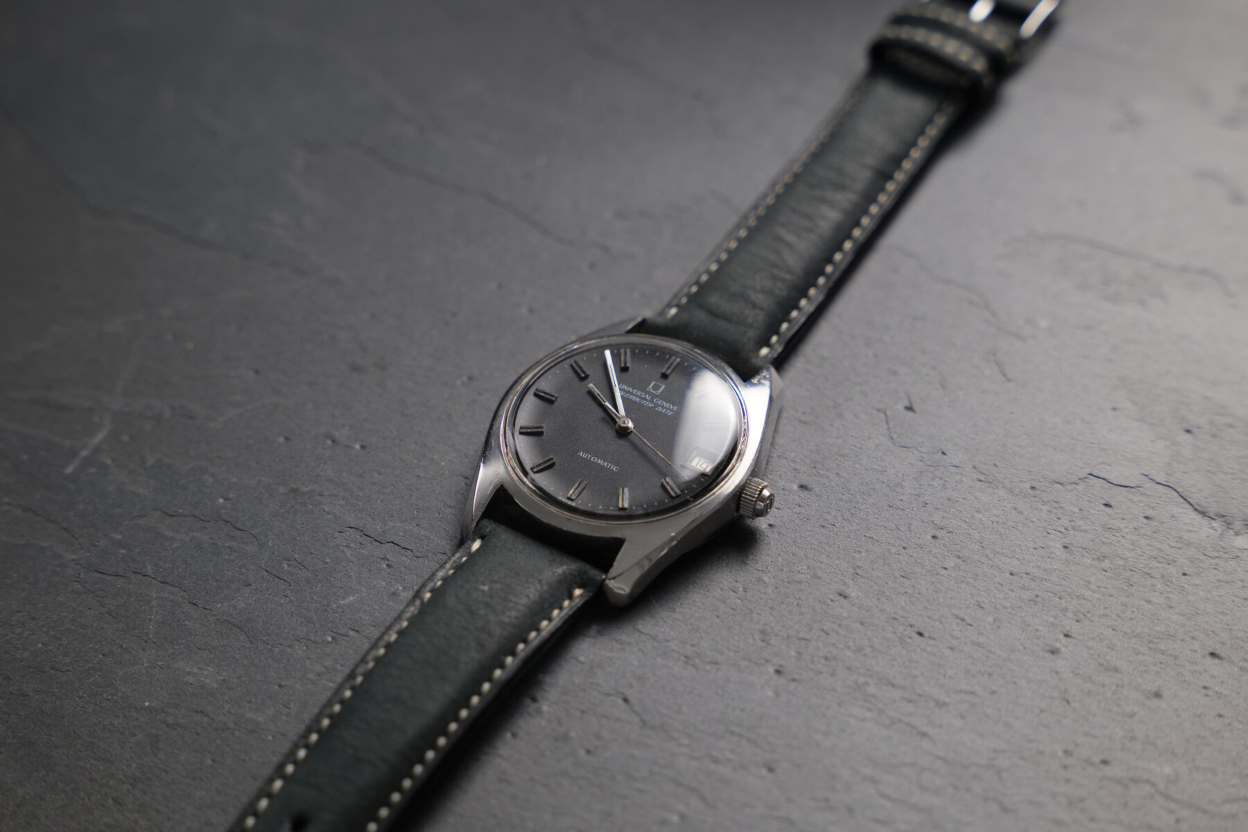 Une Polerouter pas commune par son beau cadran noir mat incurvé convexe, ses larges index en acier, sa date trapézoïdale à trois heures. Un boitier aux jolies cornes réalisé par Huguenin Frères, caractérisé par sa couronne vissée et son fond de boite qui bien que portant les rayures d’usage offre encore le beau logo bien en volume, démontrant le peu de polissages reçus par la montre.
