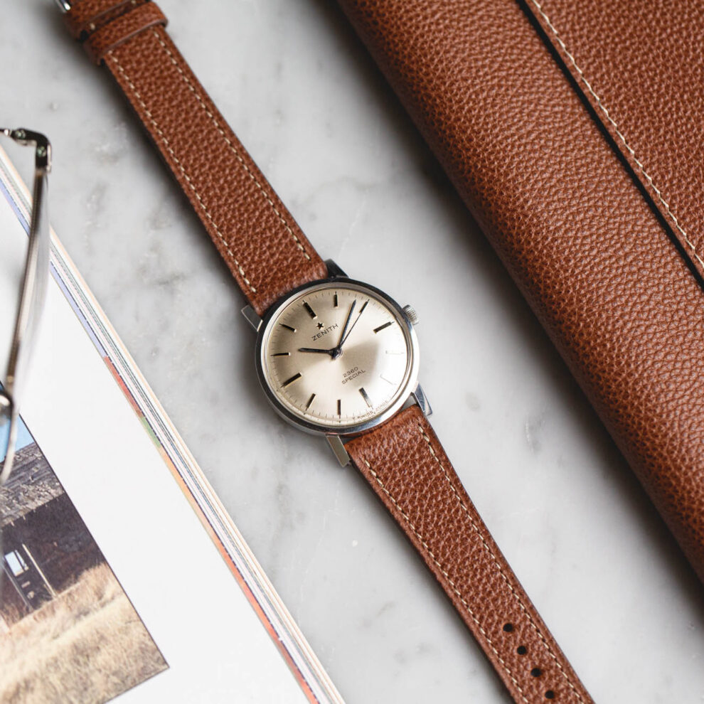 Nous apprécions la belle taille de 34 mm de cette Zenith, avec un beau cadran argenté soleillé, le logo étoilé Zenith en applique à midi et cette forme d’aiguilles propre à Zenith. Sans parler des très belles finitions de son calibre 2542.